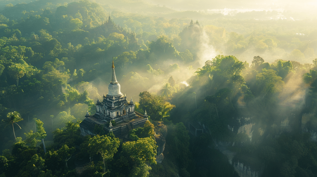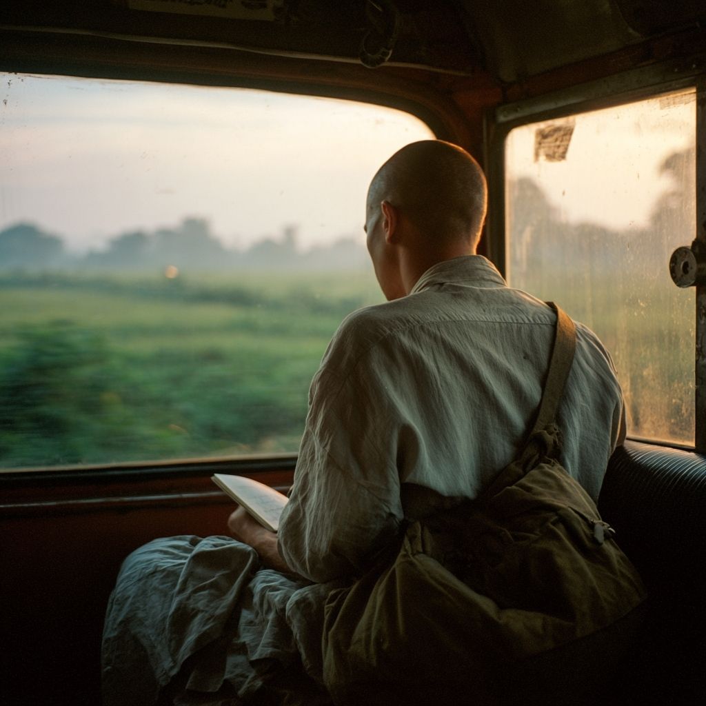 One moon has passed since I accepted the robe. My head is bare to the morning chill; days measured by the slow drift of light across the temple stones. I rise before birdsong, climb the cliff above the clearing, and face the valley. Mist blooms from the jungle canopy until sunrise lifts it like a curtain, revealing green tiers rolling to the horizon.Somewhere below, a lone hearth sends up a thin ribbon of oud smoke that mingles with the cool breath of the forest. In that mingling I find a quiet large enough to hold every thought yet small enough to fold into a single breath. When I leave tomorrow, I’ll press that silence between my notebook pages and know exactly where to find it again.
